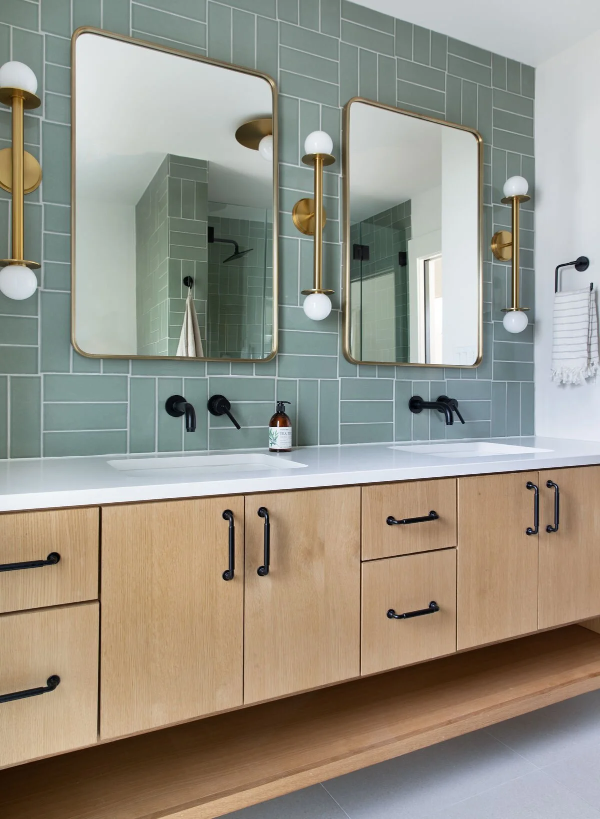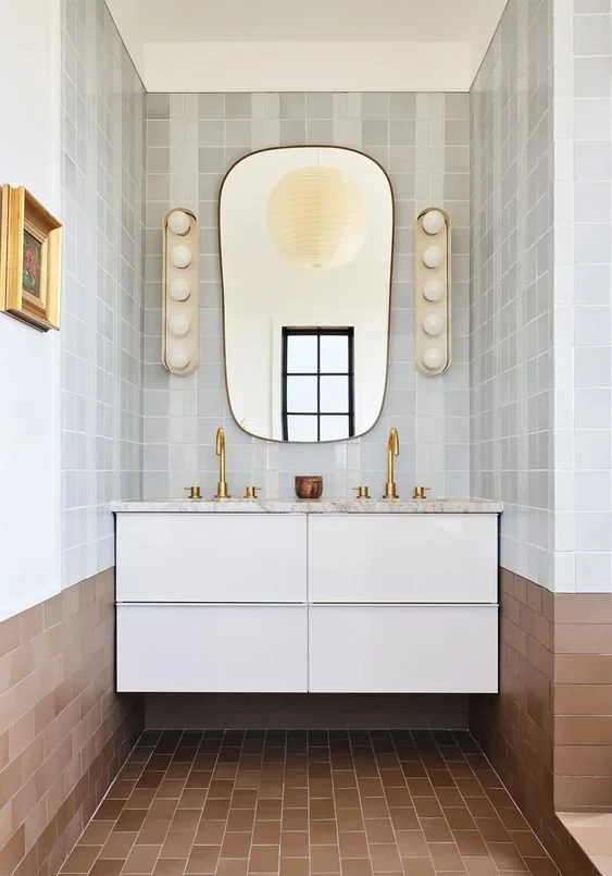 More Zellige tiles here, this time they’ve been used to create this really nice two tone look which is again a really simple idea but an effective one, especially with that wooden ledge separating the two. I particularly love how they’ve used the same tile just in a different colour, the result is really simple and chic but still impactful.