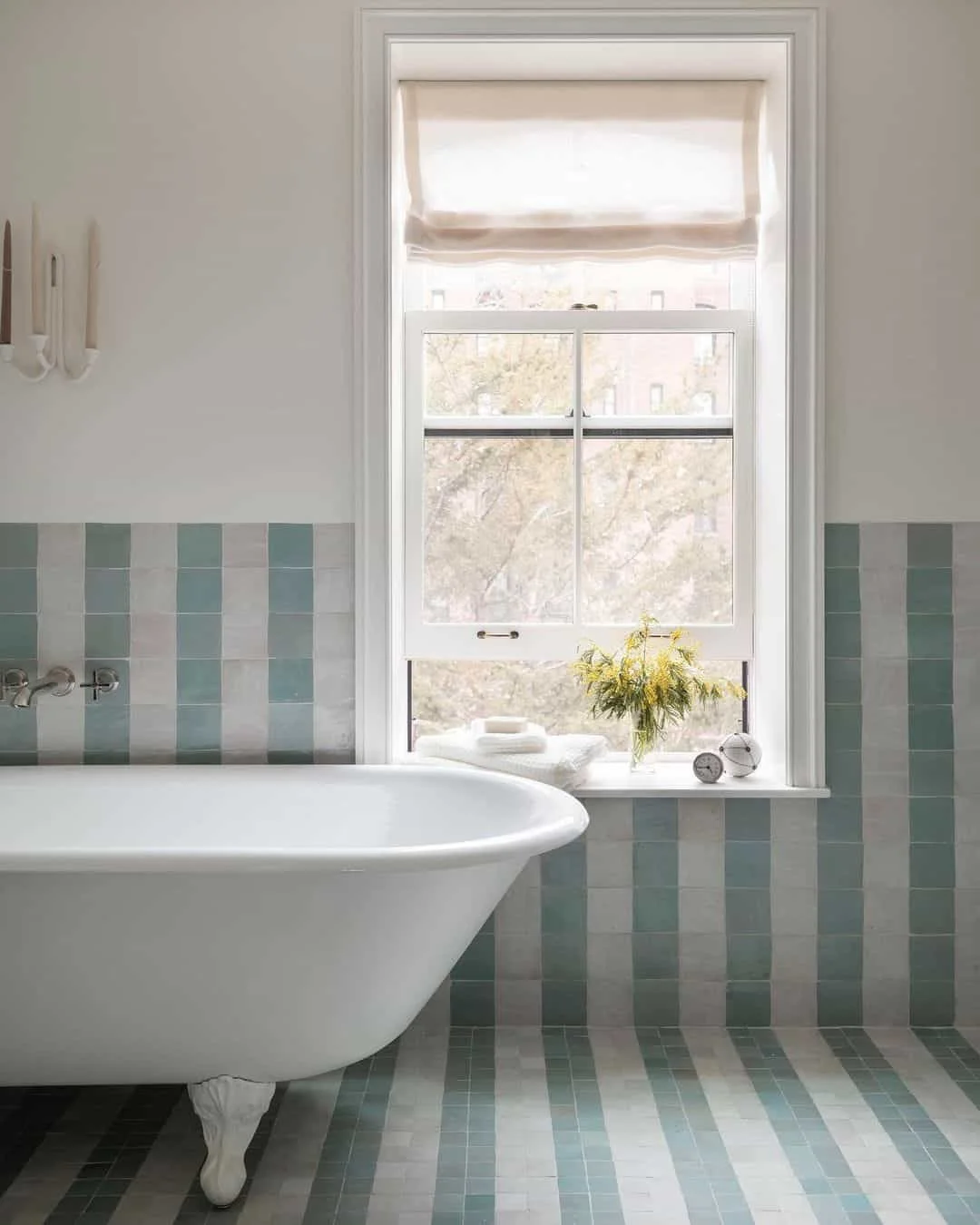 Zellige tiles are tiles which are handmade in Morocco, known for their variations in colour and texture. They’re beautiful on their own, but in this instance have been laid in a stripe pattern which is so striking and emphasises their lovely texture.