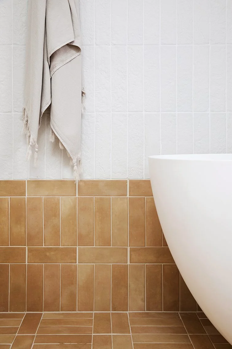 Brick tiles are so versatile and can be laid in lots of different patterns, the most classic choice being the subway or offset pattern (like bricks in a wall). In this bathroom they’ve taken a classic shaped tile and given it a twist by laying it in a parquet pattern - which is really simple but effective.